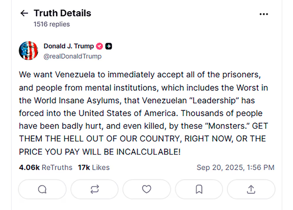 A través de un mensaje en su red social Truth Social, Trump afirmó que el chavismo envió deliberadamente a estas personas y advirtió que, de no aceptarlas de vuelta, el “precio que pagarán será incalculable”.
